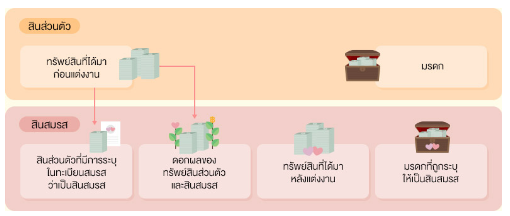 - สินสมรส คือ ทรัพย์สินที่ได้มาหลังจดทะเบียนสมรส เช่น เงินเดือน โบนัส ค่าเช่าหรือดอกเบี้ยที่ได้รับจากทรัพย์สินส่วนตัว รวมทั้งทรัพย์สินส่วนตัวและมรดกที่ระบุว่าเป็นสินสมรสตั้งแต่ตอนจดทะเบียนสมรส