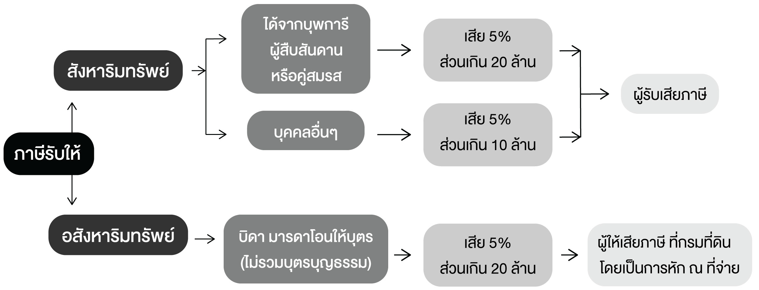 ส่วนที่เกิน 20 ล้านจะต้องเสียภาษี เสีย 5% ถ้าเป็น บุพการี / ผู้สืบสันดาน/คู่สมรส