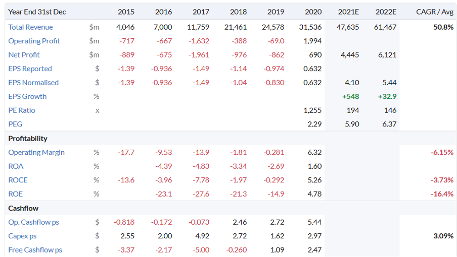 Tesla, Inc. แม้ว่าจะมี PE ที่สูงมากกว่า 150 แต่ EPS เติบโตในอนาคตกลับมีโอกาสเติบโตมากขึ้น ปี 2021 นักวิเคราะห์ประเมินว่าจะมี EPS ประมาณ USD 4.1 ซึ่งจะเติบโตมากขึ้นไปอีกในปี 2021