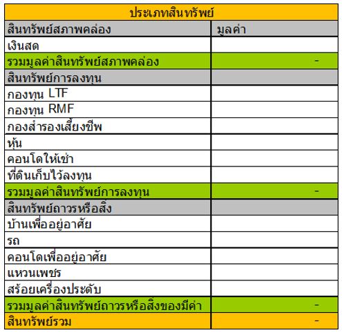 - สินทรัพย์เพื่อการลงทุน เช่น กองทุน ตราสารประเภทต่างๆ เช่นหุ้น ตราสารหนี้ และ ประกันแบบออมทรัพย์และแบบควบการลงทุน (คิดมูลค่าเงินสด) ที่ดิน คอนโดให้เช่า(ที่ไม่ได้อยู่เอง)