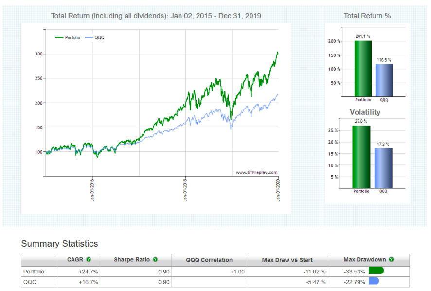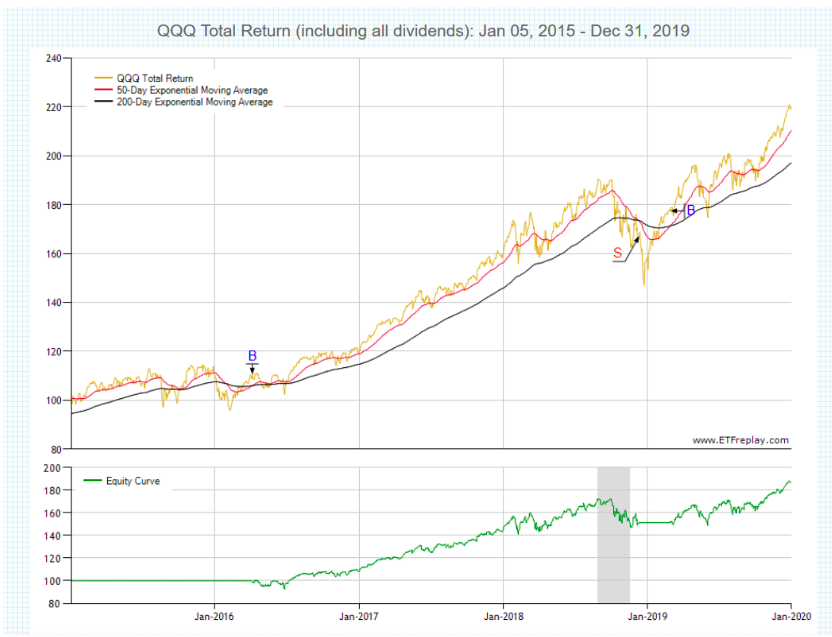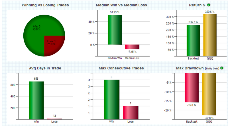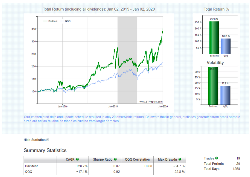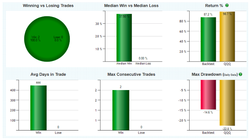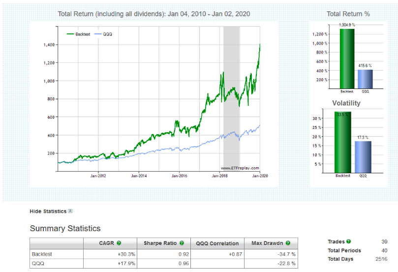 จะได้ผลคล้าย ๆ กับกลยุทธ์แรกที่เป็น Buy and Hold คือ ได้ผลตอบแทนสูงกว่า QQQ ตัวเดียว แต่จะได้ความผันผวนที่สูงกว่า เกิด Max Drawdown ได้มากกว่า
