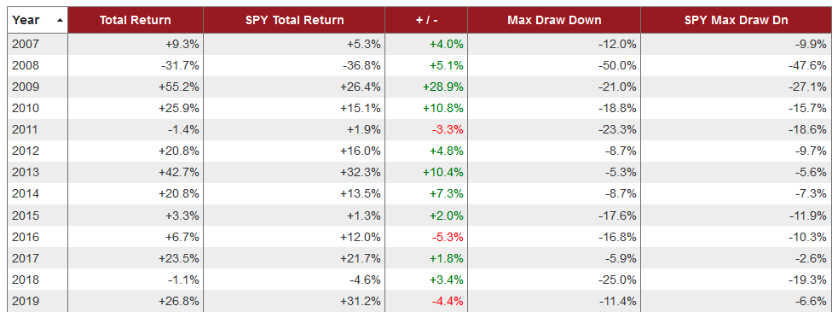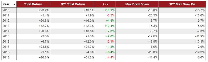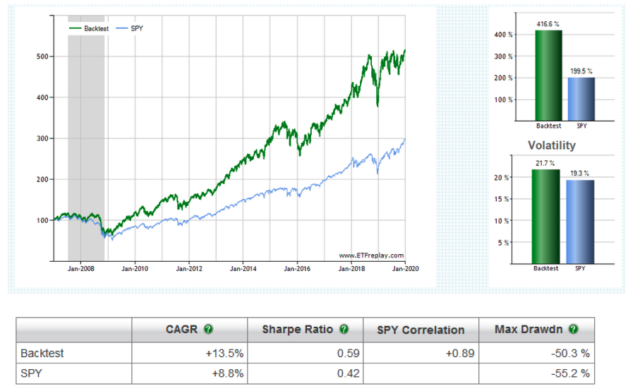 โดย SPY มีผลตอบแทนต่อปีอยู่ที่ 8.8% แต่ กลยุทธ์ทำได้อยู่ที่ 13.5% โดยสามารถเอาชนะ ไปได้ 10 ปี และแพ้เพียง 3 ปีเท่านั้น