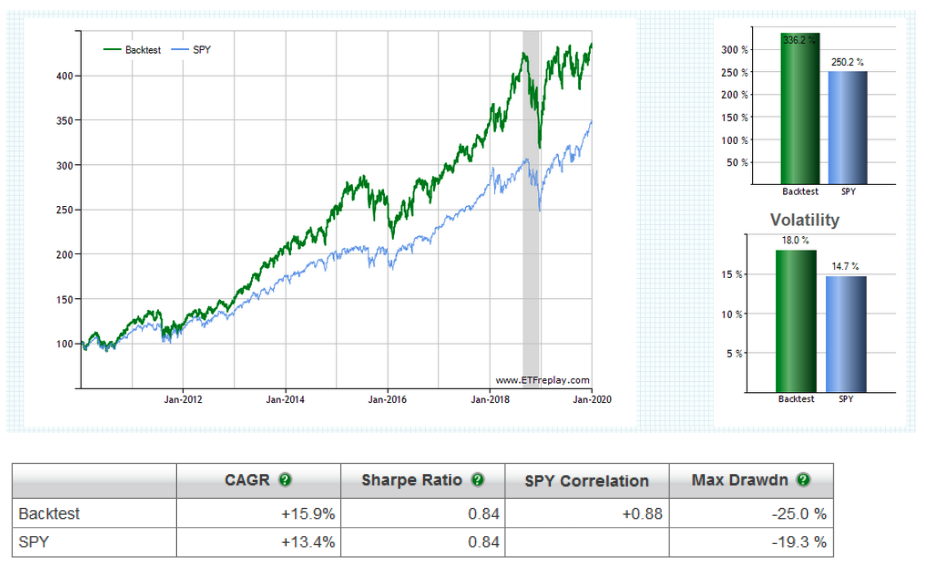 โดย SPY มีผลตอบแทนต่อปีอยู่ที่ 13.4% แต่ กลยุทธ์ทำได้อยู่ที่ 15.9% โดยสามารถเอาชนะ ไปได้ 7 ปี และแพ้เพียง 3 ปีเท่านั้น