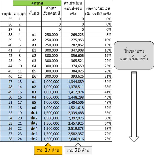 ค่าใช้จ่ายการศึกษาทั้งหมด ถ้าไม่คิดเงินเฟ้อจะอยู่ที่ 17 ล้าน แต่ถ้าคิดเงินเฟ้อ อยู่ที่ 26 ล้าน