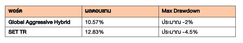 ในระยะ 1 ปี ผลตอบแทนของพอร์ตอยู่ที่ 7.25% ใกล้เคียงกับผลตอบแทนคาดหวังที่ตั้งไว้ที่ 8% แต่ Max Drawdown กลับดีกว่าถึง 2 เท่าของ SET TR คือ Max Drawdown ของ SET TR จะอยู่ที่ -13% แต่พอร์ตจะอยู่ที่ -7% เท่านั้น