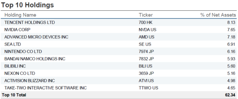 จะลงทุนใน ESPO ETF ซึ่งจะลงทุนในเฉพาะอุตสาหกรรมเกมและ Esport เท่านั้น โดยมี Top 10 Stock ที่ถือ