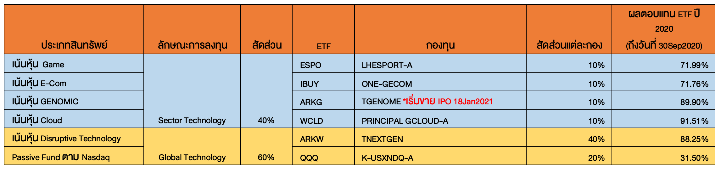 - ใส่น้ำหนักลงทุนใน Sector ETF ที่มีการเติบโตในอนาคต ได้แก่ E-Com, Game, Cloud และ GENOMIC