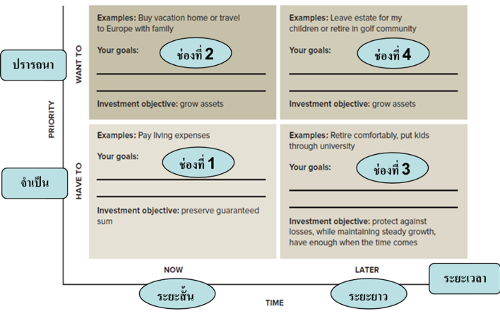 ให้กำหนดเป้าหมายของชีวิต เช่น การศึกษาบุตร / การเกษียณ / พาลูกไปเที่ยวต่างประเทศ หลังจากนั้น ให้เขียนมาเขียนลงใน 4 ช่องตามดังนี้