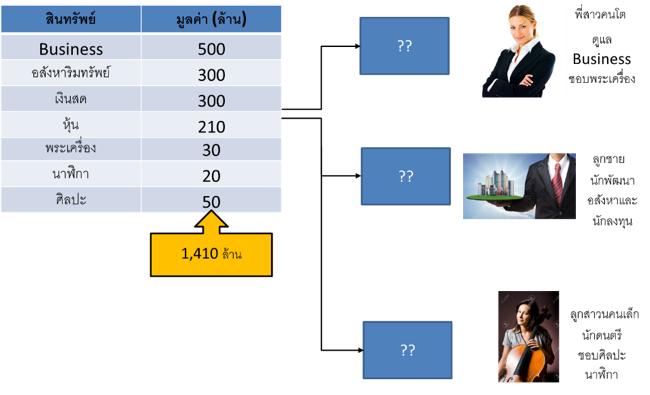 จากรูปเราจะส่งต่อสินทรัพย์ในทายาทอย่างไร ถ้าความต้องการ ความพร้อม ความเหมาะสมของคนรับ และสินทรัพย์ที่จะให้ไม่สอดคล้องกัน ที่สำคัญเมื่อแบ่งแล้ว จะมีความยุติธรรมในมูลค่าหรือไม่