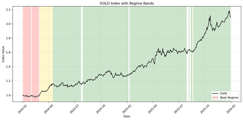 กราฟ Gold Index ก็แสดงสถานะ “Strong Bull Regime” (แถบสีเขียว) ควบคู่ไปกับหุ้นเช่นกัน โดยเฉพาะในช่วงปลายปีที่ผ่านมาที่เร่งตัวขึ้นอย่างชัดเจน