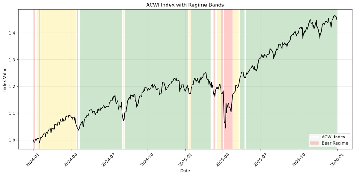 แถบสีเขียวขวาสุดแสดงให้เห็นว่า Global Equity Regime ปัจจุบันยังคงสถานะ “Bull Market” อย่างแข็งแกร่ง แม้จะมีการพักตัวช่วงต้นปี 2025 (โซนสีแดง) แต่ดัชนีสามารถดีดกลับทำ New High ได้ต่อเนื่อง