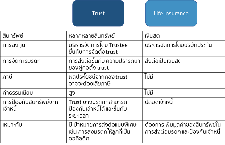 หลายคนอาจจะคุ้นเคยกับประกันชีวิต (Life Insurance) ในการส่งต่อมรดก แต่ไม่รู้จัก Trust ก็เพราะว่า คนที่จัดตั้ง Trust ได้ ต้องมีสินทรัพย์สูงเพียงพอที่จะคุ้มค่าในการจัดตั้ง