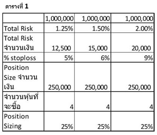 ถ้าต้องการถือหุ้น 4 ตัว โดยที่จะเสี่ยงไม่เกิน 1.5% ของพอร์ตลงทุน คือ 1,000,000 เราจะซื้อหุ้นได้จำนวนเงินที่ 250,000 หรือ 25% position size โดยจะมี Stop loss ที่ 6%