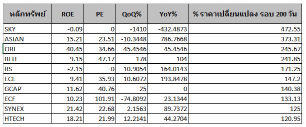 ลองมาดูหุ้นผู้ชนะ Winning Stockโดยเรียงลำดับจาก Ranking ของ Relative Strength ในรอบ 200 วัน