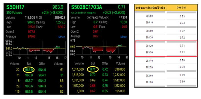 ตัวอย่างการดู Bid-Offer ของ TFEX เมื่อเทียบกับราคา DW น่ะครับ