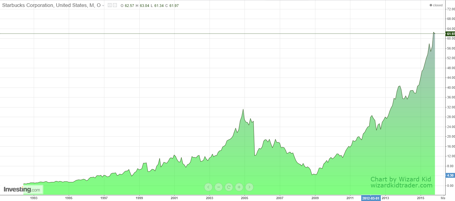 โดยราคา IPO (Initial Public Offering) ของหุ้น SBUX ณ วันที่ 26 มิถุนายน 2535 หรือ ปี ค.ศ. 1992 นั้น อยู่ที่ราคา 17 เหรียญดอลล่าห์สหรัฐต่อหุ้น (หรือ 0.27 เหรียญดอลล่าห์ต่อหุ้น หลังจากการแตกพาร์ทั้งหมด 6 ครั้งนับตั้งแต่เข้าตลาดหุ้นมาจนถึง ณ ปัจจุบัน) โดยราคาหุ้น SBUX ปิดที่ 21.50 เหรียญดอลล่าห์สหรัฐต่อหุ้น (หรือ 0.34 เหรียญดอลล่าห์สหรัฐต่อหุ้นหลังปรับพาร์ใหม่) ..แค่เริ่มต้นก็เปิดตัวหล่อเลยน่ะเรา!