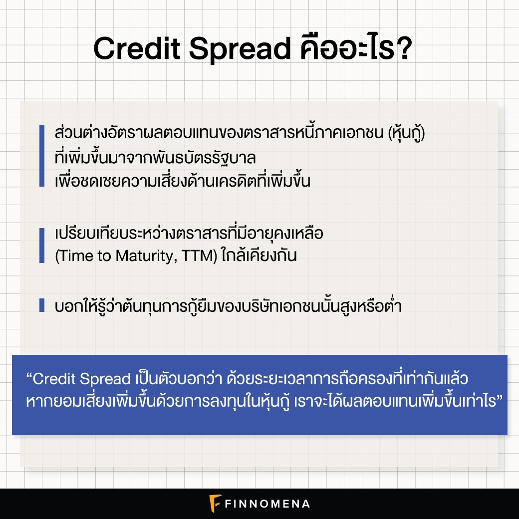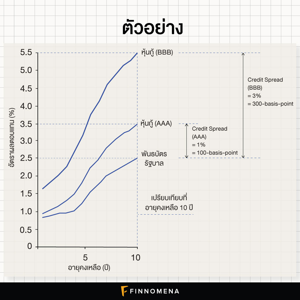 ในมุมของผู้ซื้อตราสาร พูดอีกแบบคือ Credit Spread เป็นตัวบอกว่า ด้วยระยะเวลาการถือครองที่เท่ากันแล้ว หากยอมเสี่ยงเพิ่มขึ้นด้วยการลงทุนในหุ้นกู้ เราจะได้ผลตอบแทนเพิ่มขึ้นเท่าไร