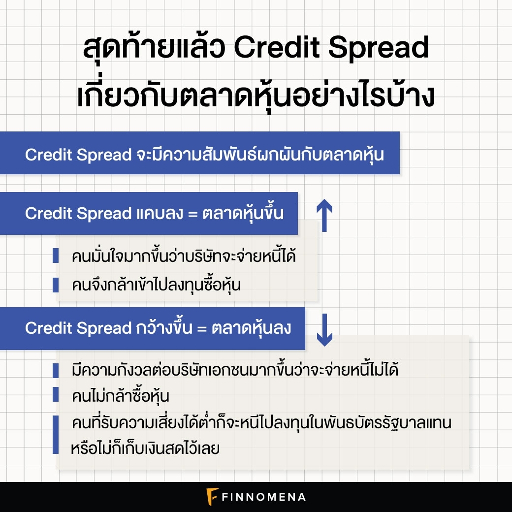 Credit Spread จะมีความสัมพันธ์ผกผันกับตลาดหุ้น กล่าวคือ หาก Credit Spread แคบลง ฝั่งตลาดหุ้นมักจะปรับตัวขึ้น เนื่องเพราะคนมั่นใจมากขึ้นว่าบริษัทจะจ่ายหนี้ได้ สะท้อนให้เห็นความมั่นคงของบริษัทมากขึ้น คนจึงกล้าเข้าไปลงทุนซื้อหุ้นด้วย เพื่อรับโอกาสได้ผลตอบแทนที่สูงกว่า