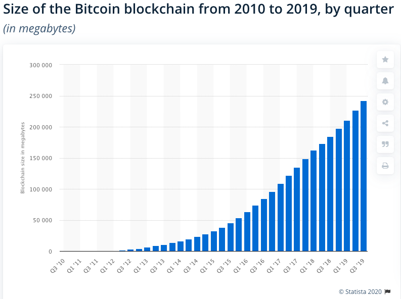 ถ้าหากอยากรู้ว่า Blockchain ได้รับความนิยมแค่ไหน ก็ลองดูได้จากขนาดข้อมูลระบบ Blockchain ของ Bitcoin ซึ่งข้อมูลจาก Statista ระบุให้เห็นเติบโตทุกปี โดยข้อมูลล่าสุดเมื่อไตรมาสที่ 3 ปี 2019 นั้นความใหญ่โตของข้อมูลในระบบอยู่ที่ 242,386 เมกะไบต์ (MB) หรือ 242 กิกะไบต์ (GB)[viii] ซึ่งเทียบเท่ากับการสตรีม Netflix คุณภาพ Ultra HD เป็นเวลาติดต่อกัน 34 ชั่วโมง[ix]