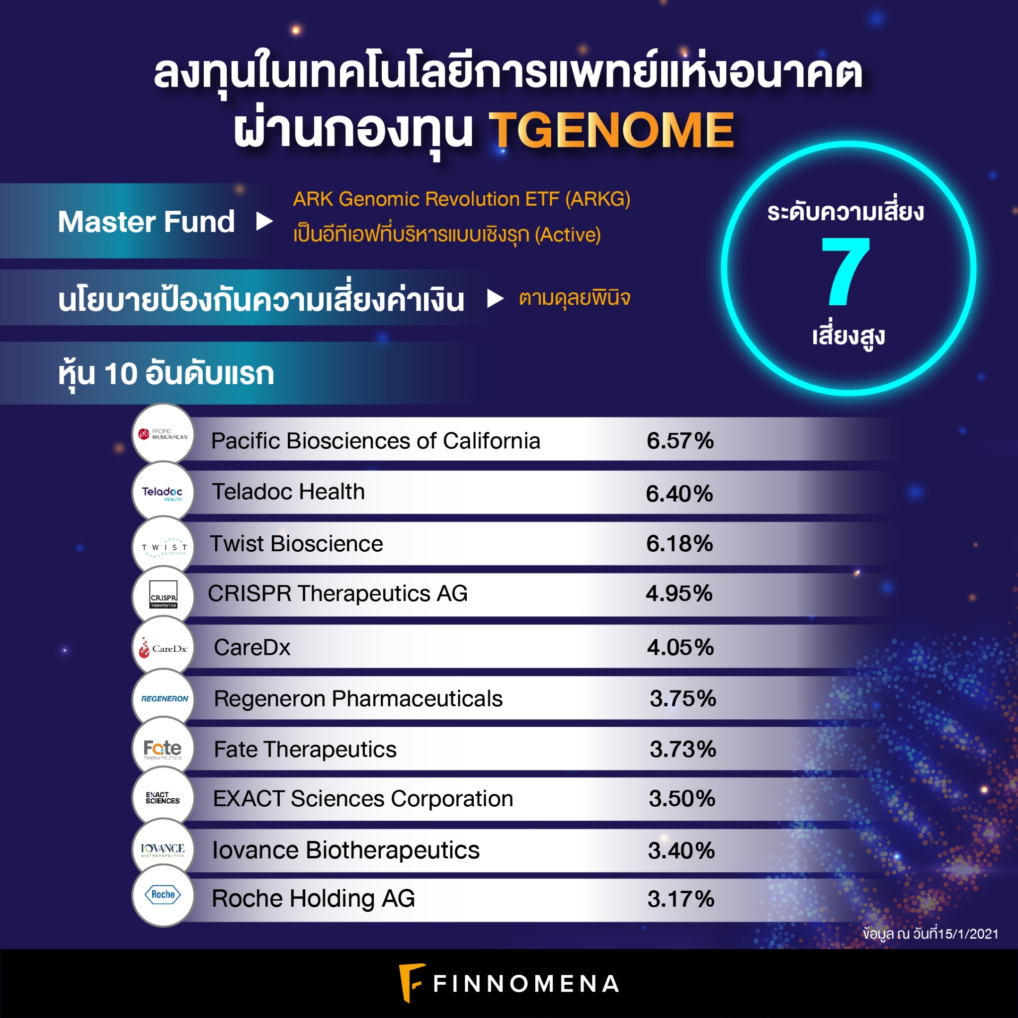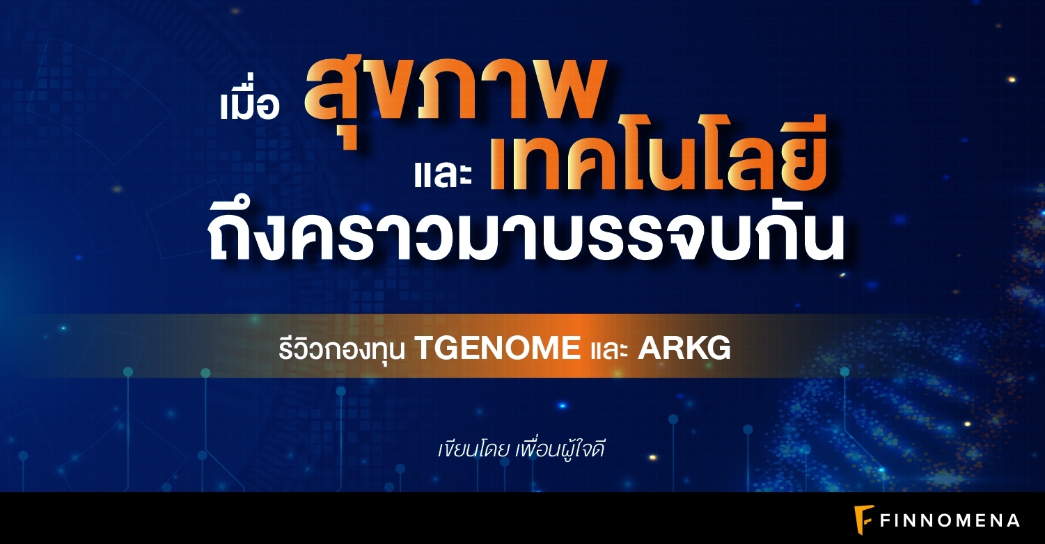 กองทุน ARKG ซึ่งเราสามารถลงทุนได้ผ่านกองทุน TGENOME นั้นถือว่าเป็นอีกหนึ่งทางเลือกสำหรับใครที่สนใจอยากเกาะกระแสเทรนด์การรักษาสุขภาพรูปแบบใหม่ที่ใช้เทคโนโลยีและความก้าวหน้าด้านจีโนมมาช่วยยกระดับ แม้จะมีความเสี่ยงค่อนข้างสูง แต่เนื่องจากมีการพัฒนาทางด้านเทคโนโลยี จึงมีโอกาสที่ต้นทุนในการวิจัยและพัฒนาจะมีแนวโน้มถูกลง ในขณะที่การรักษาก็จะมีประสิทธิภาพยิ่งขึ้น และเมื่อถึงจุดหนึ่ง เทคโนโลยีนี้อาจจะถูกนำไปใช้ต่อยอด ใช้ประโยชน์ได้ในอีกหลายอุตสาหกรรม (ไม่ใช่แค่ Healthcare) เท่านั้น จึงมีโอกาสที่บริษัทธีม Genomics จะเติบโตสูงในอนาคต และเป็นโอกาสการลงทุนระยะยาวที่น่าสนใจ (ย้ำว่า “ระยะยาว”)