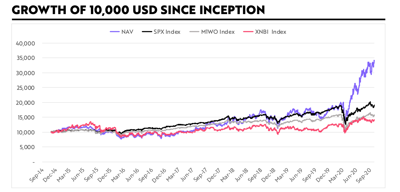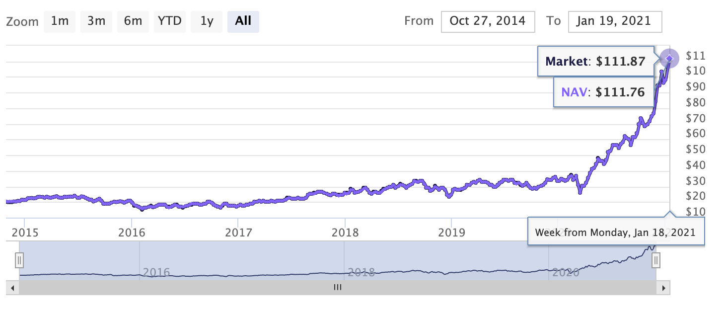 เพื่อให้เห็นภาพกันอีกนิด ลองมาดูกราฟนี้ที่จำลองว่าหากเราลงทุนใน ARKG ด้วยเงิน $10,000 (ประมาณ 300,000 บาท) ตั้งแต่จัดตั้งกองทุน ซึ่งก็คือตั้งแต่เดือนตุลาคมปี 2014 ผ่านมาเป็นเวลา 6 ปี ณ วันที่ 30 ก.ย. 2020 เงินลงทุนจะโตขึ้นจนเกือบแตะระดับ $35,000 (ประมาณ 1,050,000 บาท) เลยทีเดียว