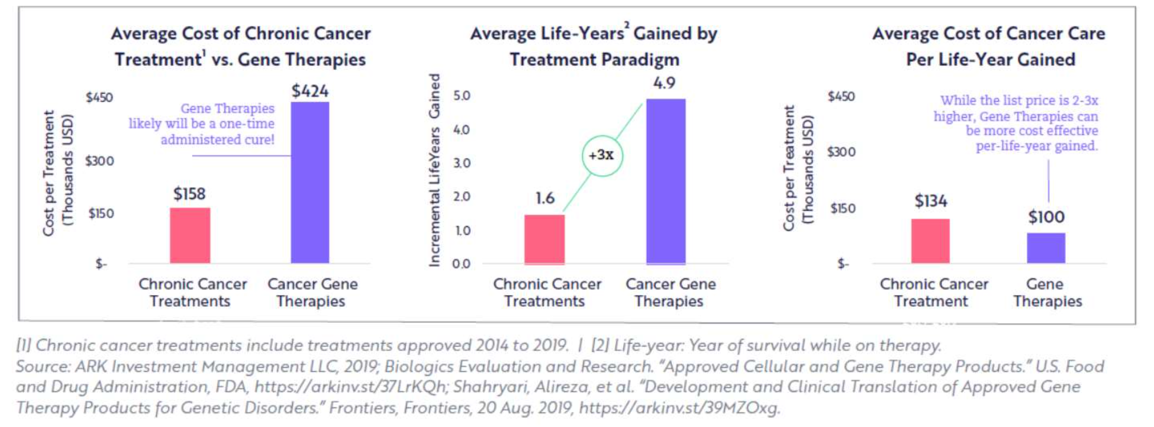 ตัวอย่างที่น่าสนใจของ Living Therapies ก็เช่น การใช้ CAR T Cells ในการกำจัดมะเร็ง โดยสร้าง CAR T Cells ในห้องทดลอง แล้วฉีดเข้าไปในร่างกายมนุษย์ เพื่อให้มันเข้าไปกำจัดมะเร็ง จากนั้นก็ค่อยเจาะลึกดูดมันออกมาเพื่อใช้ต่อไปเรื่อย ๆ โดยคาดว่ามูลค่าตลาดของการรักษาด้วย CAR T-Cell จะยิ่งเพิ่มสูงขึ้นอีก หากใช้กับมะเร็งระยะเริ่มต้นได้ แม้ว่าต้นทุนจะแพง แต่มีประสิทธิภาพสูงกว่าวิธีอื่น ๆ