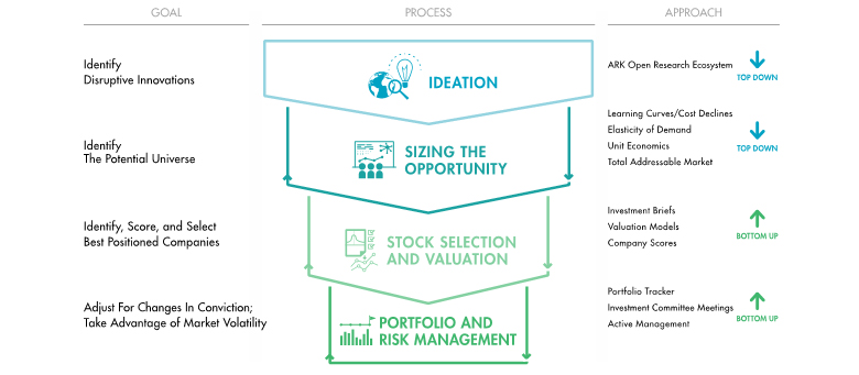 - Ideation: เป็นการค้นหานวัตกรรมที่จะมา Disrupt ของเดิม ผ่าน ARK Open Research System ซึ่งไม่ได้พึ่งพิงแค่ข้อมูลทางการเงินทั่วไป แต่ยังมีการควบรวมข้อมูลจาก Social Media และ Crowdsourcing ด้วย สมกับเป็นบริษัทแห่งนวัตกรรมที่ใช้เทคโนโลยีเข้ามาช่วยในการหาข้อมูล