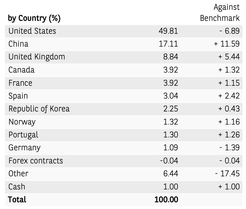ลงทุนในสหรัฐฯ เป็นหลัก แต่ก็ยังถือว่าน้อยกว่าดัชนี และมีการกระจายไปลงทุนในจีนมากกว่าดัชนี