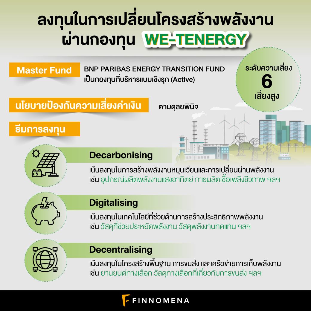 WE-TENERGY หรือชื่อเต็มคือ กองทุนเปิด วี นิว ทรานซิชั่น เอนเนอร์จี เป็นกองทุนใหม่สด ๆ ร้อน ๆ จากบลจ. วี เสนอขายครั้งแรก 18-24 กุมภาพันธ์ 2021 นี้ ซึ่งจะลงทุนในกองทุนต่างประเทศอย่าง BNP PARIBAS ENERGY TRANSITION FUND อีกทีหนึ่ง โดยกองทุน WE-TENERGY จะป้องกันความเสี่ยงตามดุลยพินิจของผู้จัดการกองทุน