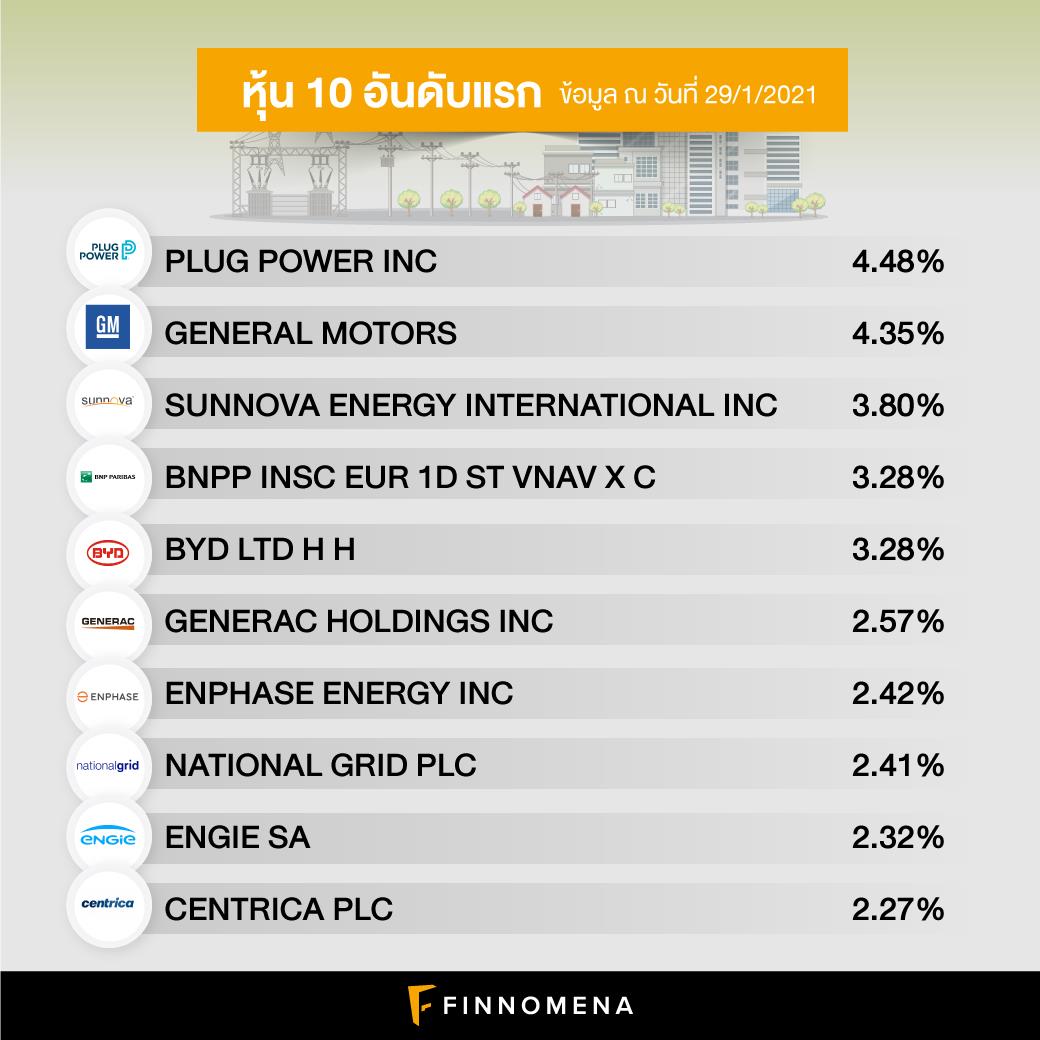 PLUG POWER (4.48%): บริษัทผู้พัฒนาและผลิตแบตเตอรี่พลังงานไฮโดรเจนที่ใช้กันในอุปกรณ์และรถยนต์ที่ต้องใช้ไฟฟ้า โดยเฉพาะพวกรถยกของในโรงงาน ที่พอใช้แบตเตอรี่แบบไฮโดรเจนแล้วก็ทำให้การทำงานลื่นไหลขึ้น ไม่มีสะดุด บริษัทมีลูกค้าเป็นบริษัทรายใหญ่ ๆ เช่น Amazon, BMW, Carrefour และ WalMart เป็นต้น