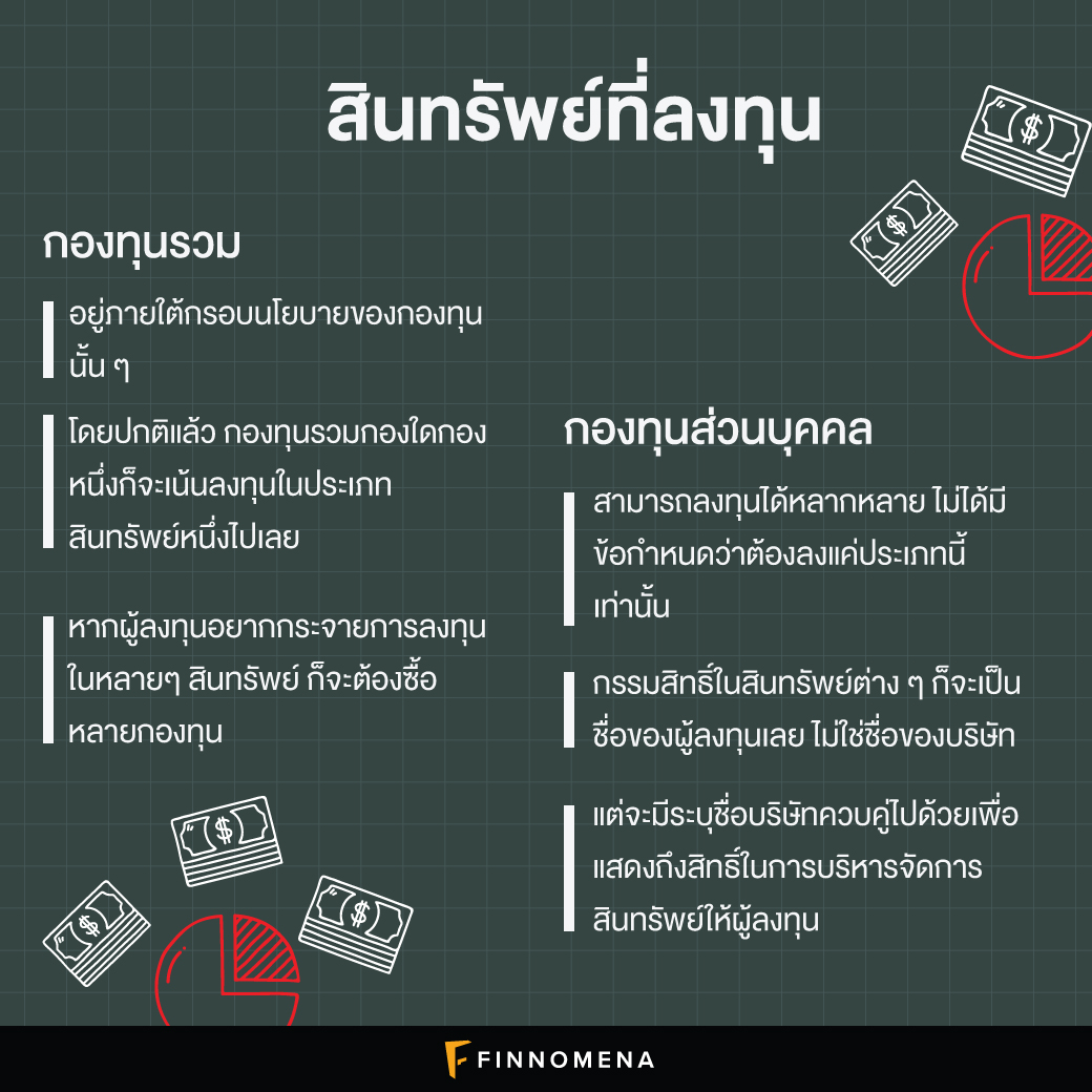โดยปกติแล้ว กองทุนรวมกองใดกองหนึ่งก็จะเน้นลงทุนในประเภทสินทรัพย์หนึ่งไปเลย เช่น กองทุนหุ้นไทย กองทุนหุ้นโลก กองทุนทองคำ กองทุนตราสารหนี้ ฯลฯ ซึ่งหากผู้ลงทุนอยากกระจายการลงทุนในหลายๆ สินทรัพย์ ก็จะต้องซื้อหลายกองทุน แต่ถ้าเป็นกองทุนส่วนบุคคล ผู้ลงทุนสามารถเลือกได้ว่าอยากลงทุนในสินทรัพย์ไหนบ้าง ไม่ได้มีข้อกำหนดว่าต้องลงแค่ประเภทนี้เท่านั้น ลงทุนได้ทั้งในและนอกประเทศ โดยกรรมสิทธิ์ในสินทรัพย์ต่าง ๆ ก็จะเป็นชื่อของผู้ลงทุนเลย ไม่ใช่ชื่อของบริษัท แต่จะมีระบุชื่อบริษัทควบคู่ไปด้วยเพื่อแสดงถึงสิทธิ์ในการบริหารจัดการสินทรัพย์ให้ผู้ลงทุน เวลาได้รับผลประโยชน์ เช่น หุ้นตัวนี้มีการจ่ายปันผล เราก็จะได้รับเต็ม ๆ ในฐานะนักลงทุนคนหนึ่ง อันนี้ไม่เหมือนในกรณีกองทุนรวมที่เราเป็นเจ้าของแค่หน่วยลงทุน ไม่ได้เป็นเจ้าของโดยตรงของสินทรัพย์ที่กองทุนไปลงทุนอีกที