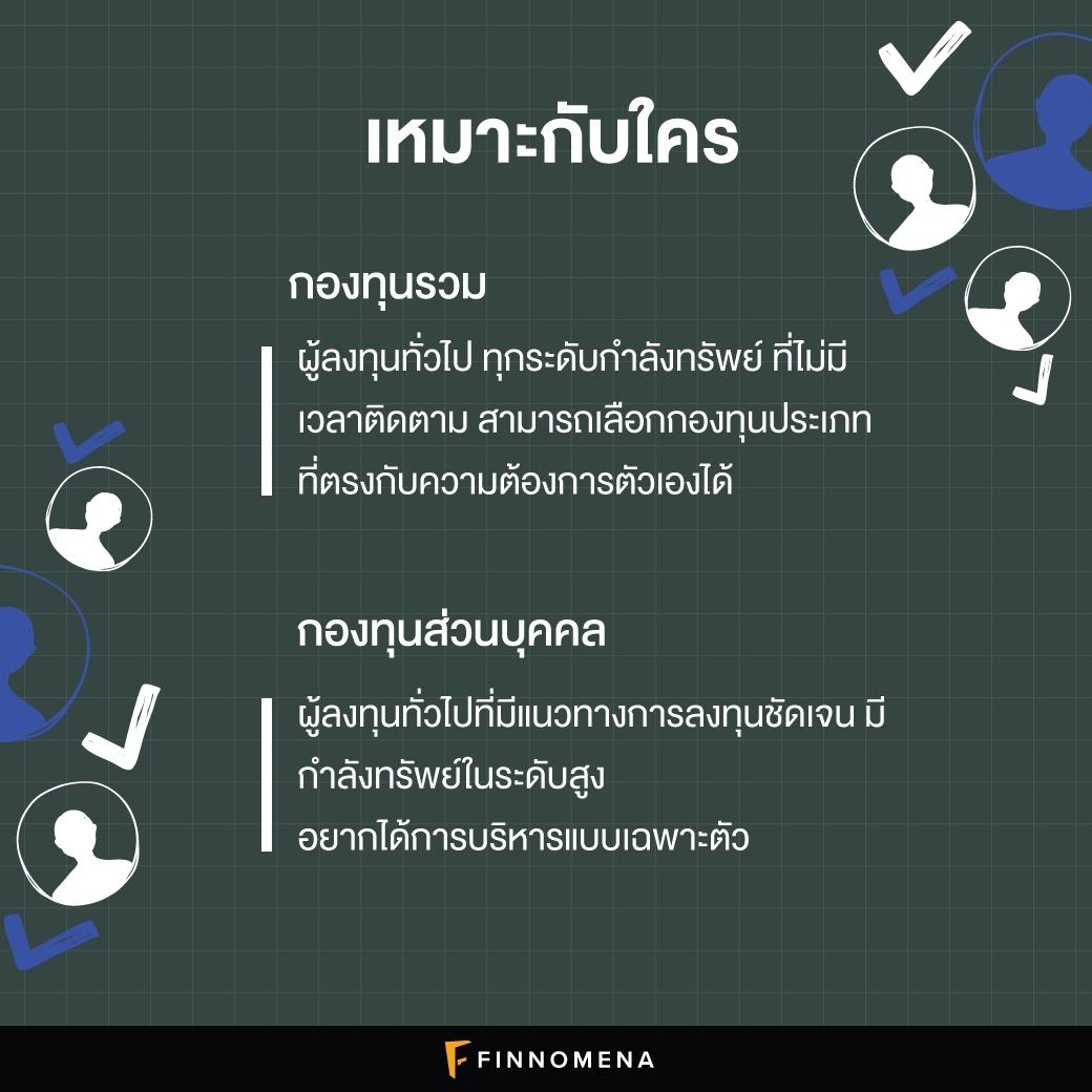 กองทุนทั้ง 2 ประเภทนี้จริง ๆ ก็เหมาะกับผู้ลงทุนที่ไม่มีเวลาติดตาม อยากได้ผู้เชี่ยวชาญมาช่วยดูแล แต่สิ่งที่ต่างกันคือหากเป็นกองทุนส่วนบุคคล ผู้ลงทุนจะสามารถมีส่วนร่วมในการกำหนดนโยบายการลงทุนได้ และการลงทุนก็จะสามารถทำได้หลากหลายสินทรัพย์ในบัญชีเดียว หากเป็นกองทุนรวมทั่วไปนั้น โดยปกติแล้วกองทุนหนึ่งก็จะลงทุนในประเภทสินทรัพย์หนึ่งไปเลย เช่น กองทุนรวมหุ้นไทย กองทุนรวมตราสารหนี้ ฯลฯ ซึ่งหากผู้ลงทุนต้องการลงทุนในหลาย ๆ สินทรัพย์ ก็จะต้องซื้อหลายกองทุนตามกันไป
