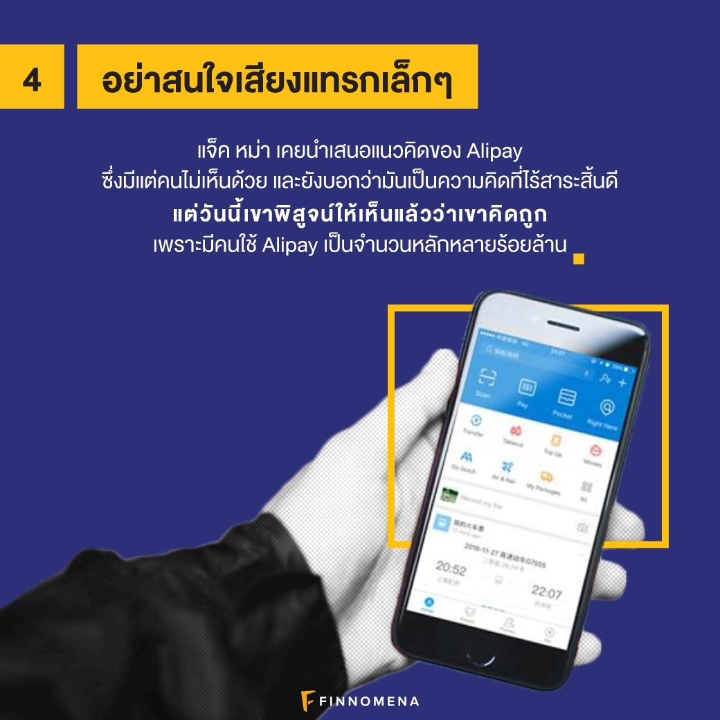 แจ็ค หม่า เคยนำเสนอแนวคิดของ Alipay ซึ่งมีแต่คนไม่เห็นด้วย และยังบอกว่ามันเป็นความคิดที่ไร้สาระสิ้นดี แต่วันนี้เขาพิสูจน์ให้เห็นแล้วว่าเขาคิดถูก เพราะมีคนใช้ Alipay เป็นจำนวนหลักหลายร้อยล้าน
