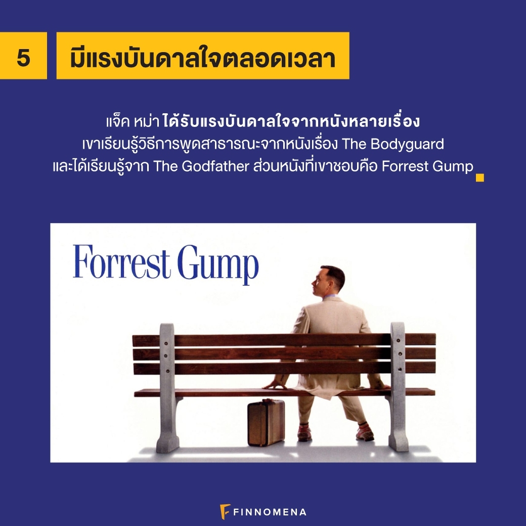 แจ็ค หม่า ได้รับแรงบันดาลใจจากหนังหลายเรื่อง เขาเรียนรู้วิธีการพูดสาธารณะจากหนังเรื่อง The Bodyguard และได้เรียนรู้จาก The Godfather ส่วนหนังที่เขาชอบคือ Forrest Gump