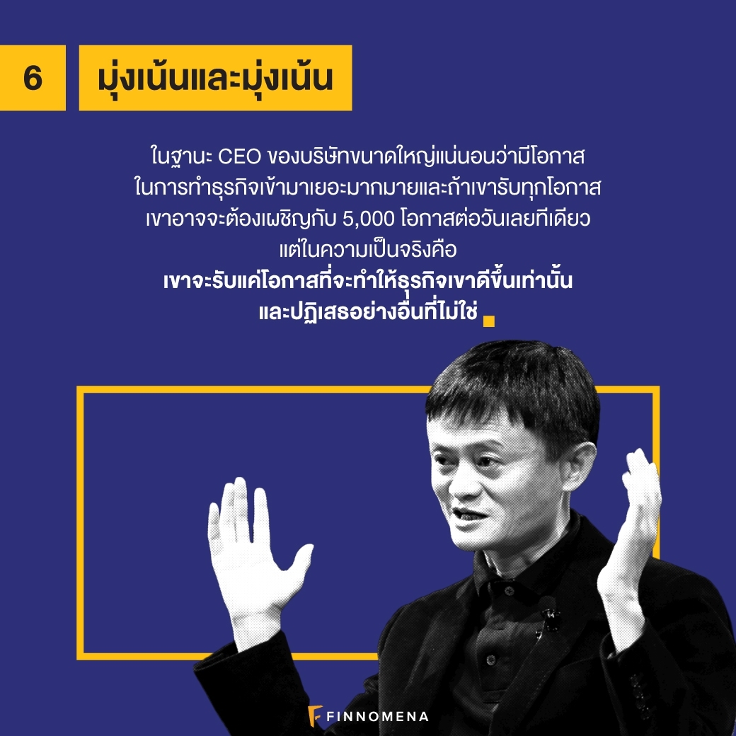 ในฐานะ CEO ของบริษัทขนาดใหญ่ แน่นอนว่ามีโอกาสในการทำธุรกิจเข้ามาเยอะมากมาย และถ้าเขารับทุกโอกาส เขาอาจจะต้องเผชิญกับ 5,000 โอกาสต่อวันเลยทีเดียว แต่ในความเป็นจริงคือเขาจะรับแค่โอกาสที่จะทำให้ธุรกิจเขาดีขึ้นเท่านั้น และปฏิเสธอย่างอื่นที่ไม่ใช่