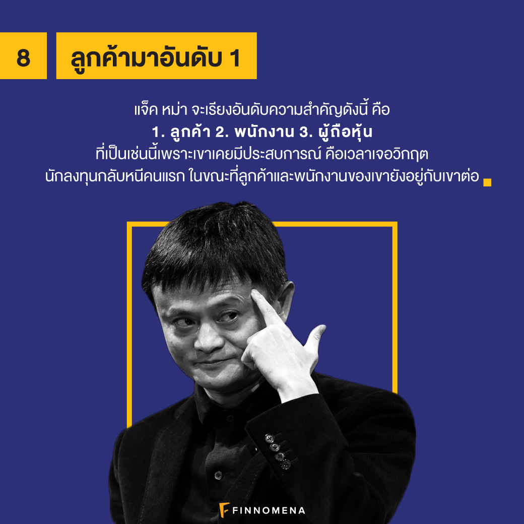 แจ็ค หม่า จะเรียงอันดับความสำคัญดังนี้ คือ 1. ลูกค้า 2. พนักงาน 3. ผู้ถือหุ้น ที่เป็นเช่นนี้เพราะเขาเคยมีประสบการณ์ คือเวลาเจอวิกฤต นักลงทุนกลับหนีคนแรก ในขณะที่ลูกค้าและพนักงานของเขายังอยู่กับเขาต่อ
