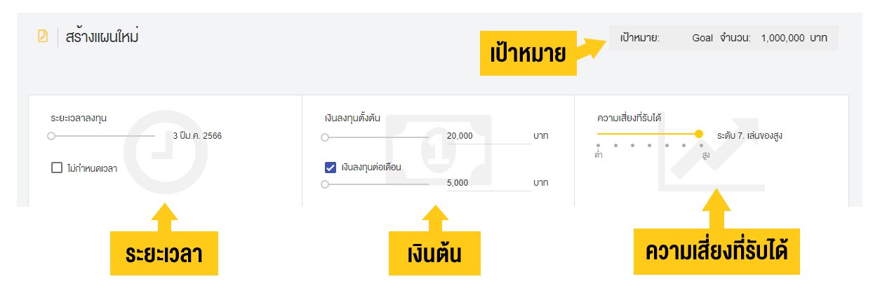 รู้จักปัจจัย 3 อย่างไปแล้ว (ระยะเวลา เงินต้น ผลตอบแทน) ทีนี้มาดูตัวอย่างการวางแผนการลงทุนจริงๆ กันบ้าง โดยขอยืมแพลตฟอร์มการสร้างแผนการลงทุน Goal ของ FINNOMENA มาใช้ประกอบความเข้าใจ