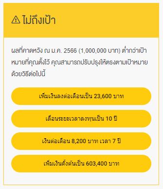 ในกรณีนี้เราต้องเลือกที่จะเพิ่มเติมอะไรสักอย่าง ไม่เพิ่มระยะเวลา เพิ่มเงินต้น ก็ต้องเพิ่มอัตราผลตอบแทน โดยระบบของ FINNOMENA ก็ใจดี คำนวณให้เราเรียบร้อยว่าควรปรับแผนยังไงบ้าง มีให้เลือกเป็นข้อๆ ตามรูปด้านบน