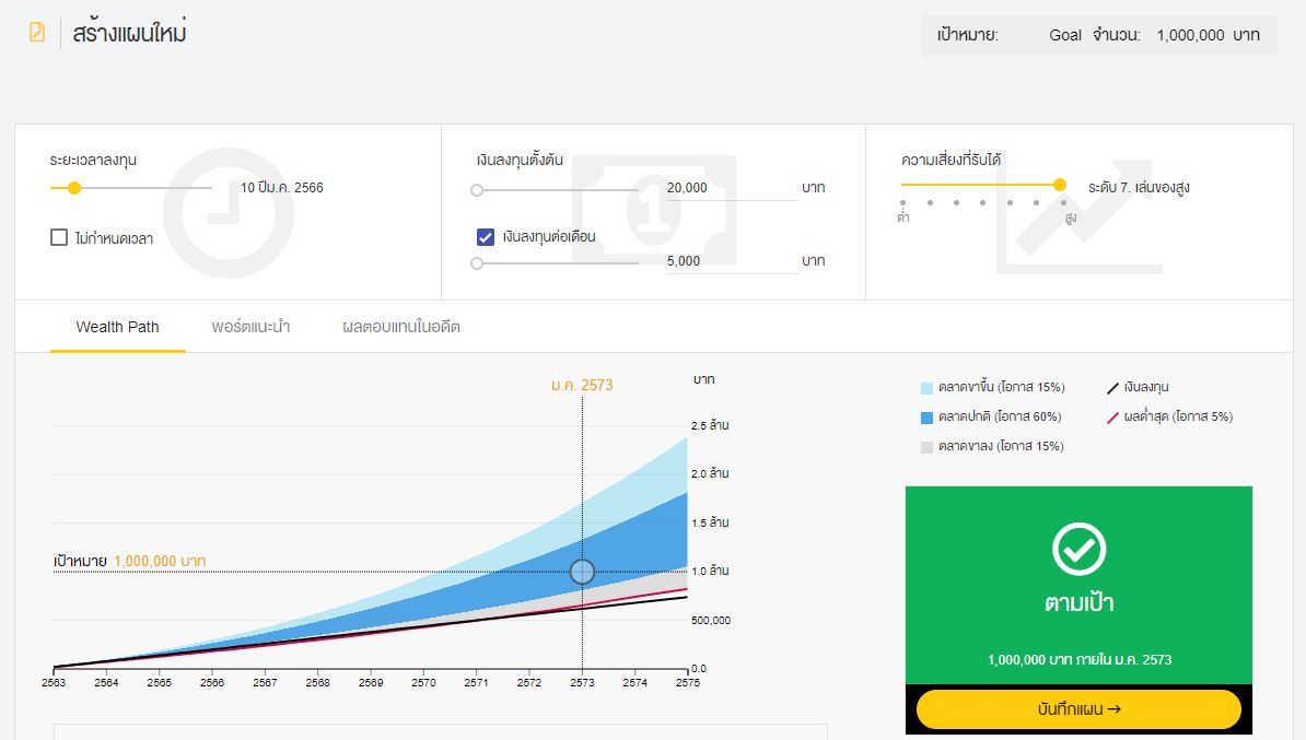 จากรูปหน้าจอการสร้างแผน เราทดลองตั้งเป้าหมายว่าจะเก็บเงินไว้เที่ยวต่างประเทศจำนวน 1,000,000 บาท โดยใช้เวลาลงทุน 3 ปี (ม.ค. 63 – ม.ค. 66) ลงเงินต้นที่ 20,000 บาท และลงทุนเพิ่มทุกเดือนเดือนละ 5,000 บาท สำหรับผลตอบแทน เราสามารถรับความเสี่ยงได้สูง เลยเลือกการลงทุนที่ความเสี่ยงสูง