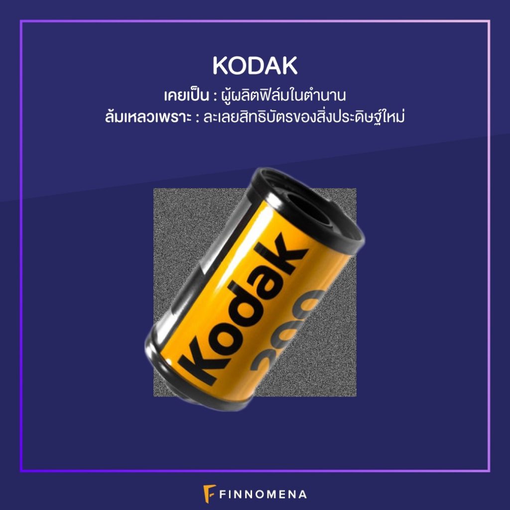 ทว่าต่อมา KODAK ก็โดน Disrupt โดยกล้องดิจิทัล แม้ว่า KODAK จะเป็นเจ้าแรกของโลกที่มีสิทธิบัตรกล้องดิจิทัลก็ตาม แต่ KODAK ก็ไม่ได้พัฒนาต่อยอด สุดท้ายก็โดนสินค้าของตัวเองที่คนอื่นพัฒนาเล่นงานจนขาดทุน