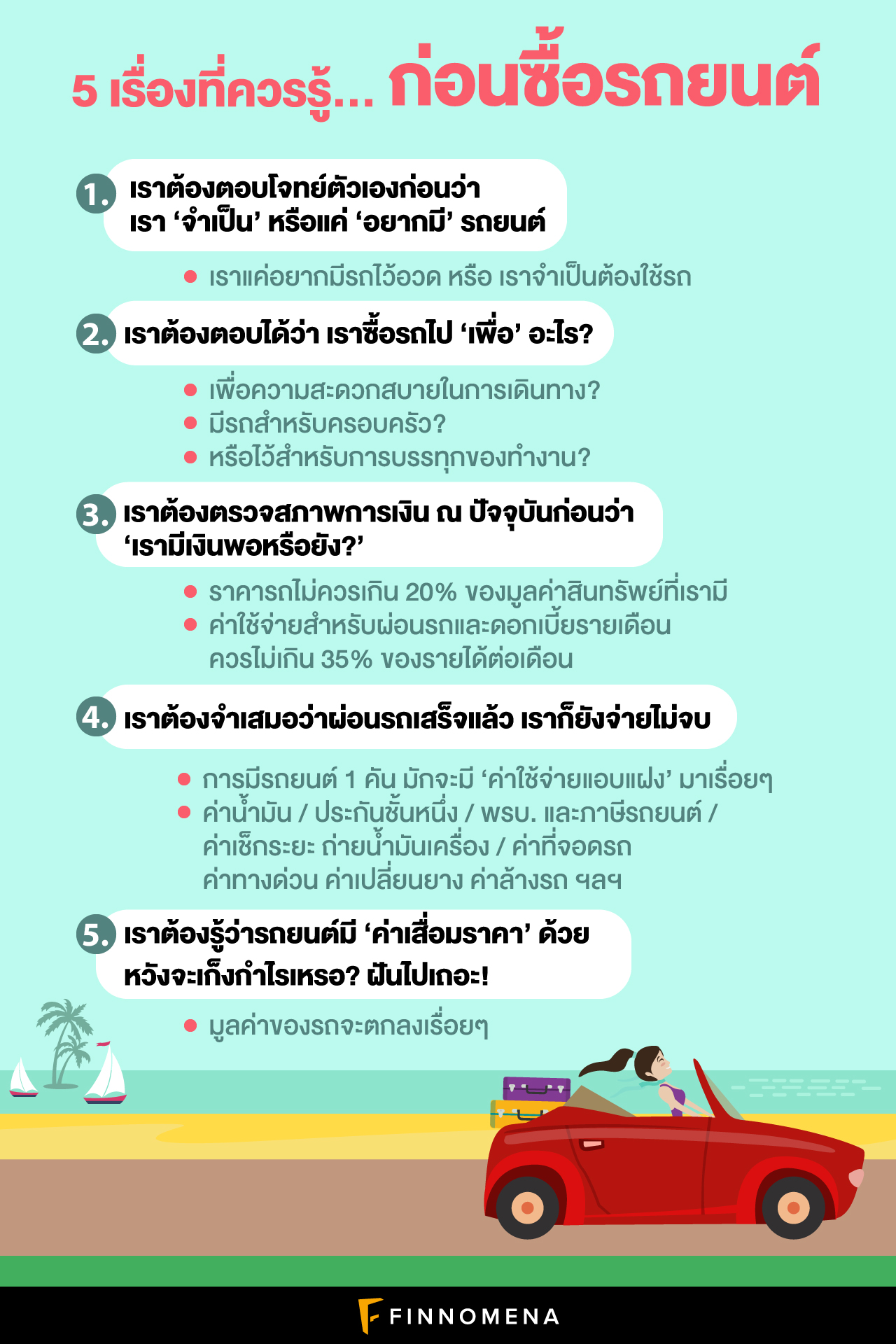 บางคนมีแค่ความคิดที่อยากจะซื้อรถ แต่ว่าอาจจะไม่ได้รู้ว่าก่อนที่จะซื้อรถยนต์ ควรมีอะไรที่ต้องรู้และพิจารณาก่อนบ้าง เราจึงสรุป 5 เรื่องสั้นๆ เพื่อให้ทุกคนสามารถตอบคำถามในใจก่อนว่า ‘สรุปแล้ว เราพร้อมกับการซื้อรถยนต์หรือยัง?’