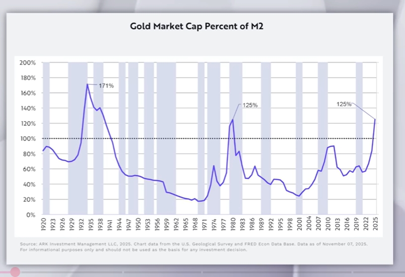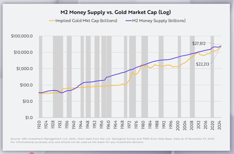 การวิเคราะห์ของ Cathie Wood ได้ยกความสัมพันธ์ของมูลค่าตลาดทองคำ (Gold Market Cap) เทียบกับปริมาณเงินในระบบเศรษฐกิจ (M2 Money Supply) มาชี้ให้เห็นสัญญาณจุดจบขาขึ้นของราคาทองคำ