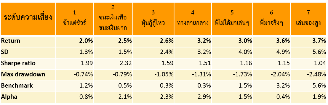 - การเลือกกองทุน สามารถสร้างผลตอบแทนส่วนเพิ่ม (Alpha) ได้สูง เนื่องจากกอง T-TSB และ CIMB-PRINCIPAL SIF สร้างผลตอบแทนได้ดีกว่าดัชนี มีเพียงความเสี่ยง 7 เล่นของสูงเท่านั้นที่ Underperform เพราะ UT-SME