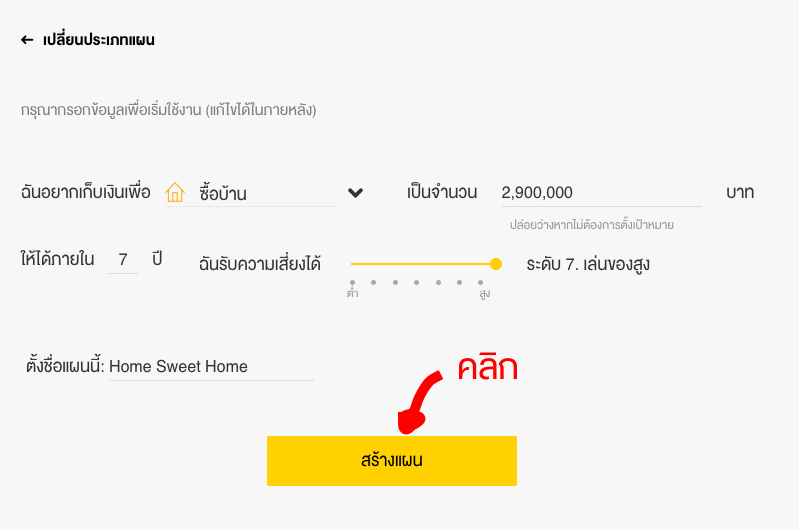 3. กรอกรายละเอียดต่างๆ เช่น จุดประสงค์การเก็บเงิน (ในที่นี้เรากรอก “ซื้อบ้าน”), จำนวนเงินเป้าหมายที่อยากได้ (ในที่นี้เรากรอก 2,900,000 บาท), ความเสี่ยงที่รับได้ (ในที่นี้เราเลื่อนไปที่ “สูงสุด”) เป็นต้น เสร็จแล้วก็กด “สร้างแผน”
