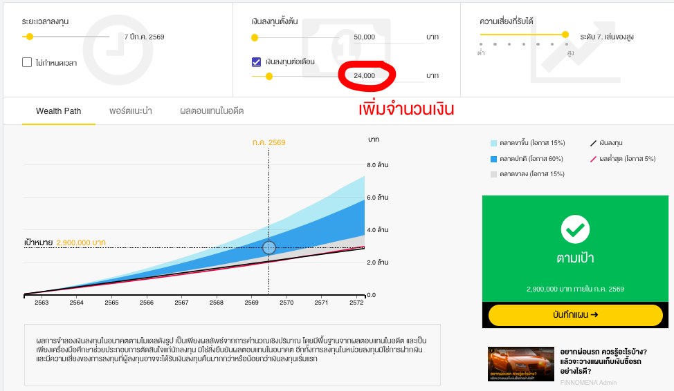 5. ถ้าแบบนี้ไม่ถึงเป้า งั้นเราลองเปลี่ยนจำนวนเงินลงทุนต่อเดือน เป็น 24,000 บาทดู โอเค ถึงเป้าแล้ว!