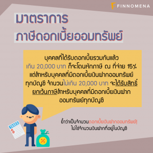 ส่วนคนที่มีเงินฝากจำนวนมากๆ คิดแบบคร่าวๆ ก็ในกรณีหลักล้านขึ้นไป ถึงจะมีโอกาสได้รับดอกเบี้ยเกิน 20,000 บาท และต้องทำการหักภาษี ณ ที่จ่าย 15% ซึ่งเป็นอัตราเดิมที่เคยเสียก่อนหน้านี้อยู่แล้วค่ะ