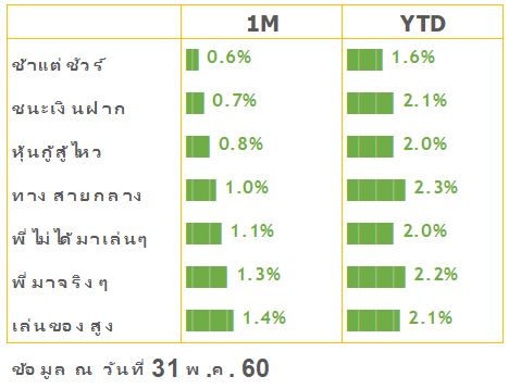 ทำให้ผลตอบแทนตั้งแต่ต้นปี (YTD) ดีขึ้นมา และมากกว่าดัชนี SET Index (YTD 1.2%) ทุกแผน แม้จะมีระดับความเสี่ยงที่ต่ำกว่า เนื่องจากแผนที่เสี่ยงสูงสุดของเรา มีสัดส่วนการลงทุนในตราสารทุน หรือหุ้น เพียง 70%
