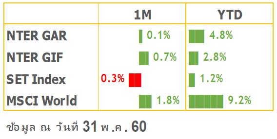 ดัชนี SET Index เดือนที่ผ่านมาลดลง -0.3% แม้พอร์ต GAR จะมีหุ้นไทยมาก แต่โดยรวม การกระจายความเสี่ยงหลายกองทุน และลงในประเทศอื่น สินทรัพย์อื่นๆด้วย ช่วยให้ดีกว่าเล็กน้อย YTD อยู่ที่ 4.8% ยังมากกว่าดัชนี SET ที่ 1.2% สาเหตุมาจาก Selection หรือการเลือกลงทุนในกองทุนที่มีความแข็งแกร่งกว่าตลาดในระยะสั้น ในขณะที่ GIF ยังคงเป็นไปตามเป้าระยะยาวของเรา