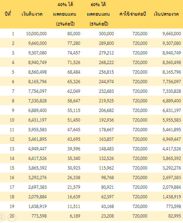 งั้นผมลองแบ่งเงินออกมาอีกก้อน 60% หรือ 6,000,000 บาท มาจัดพอร์ตกระจายความเสี่ยง และสร้างกระแสเงินสดมาใช้จ่ายระหว่างทางด้วย โดยมีผลตอบแทนคาดการณ์ 5% ต่อปี ลองดูนะครับ