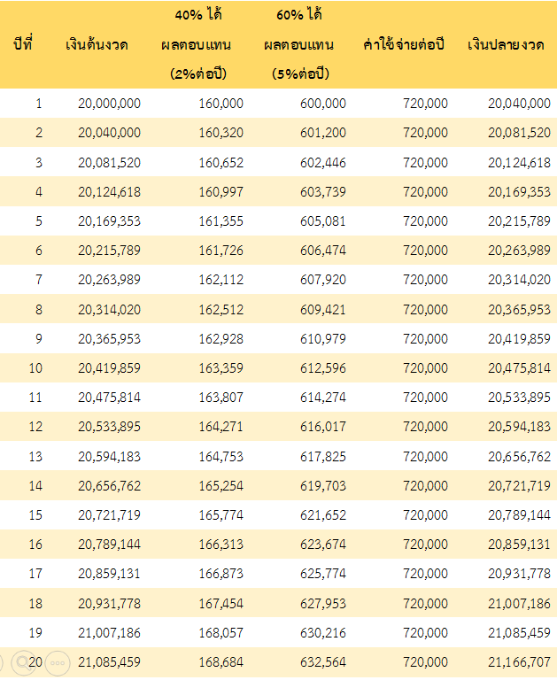 ผมขอลองอีก Scenario หนึ่งแล้วกันครับ ผมรักลูก รักภรรยามาก อยากส่งต่อเงินก้อนให้เขาในยามที่เราจากไป สร้างพอร์ตก่อนเกษียณให้ได้ 20 ล้านบาท และจัดพอร์ตแบบ 40% ในพันธบัตร และอีก 60% ในพอร์ตการลงทุนแบบสร้างกระแสเงินสดมาใช้จ่ายระหว่างทางด้วย